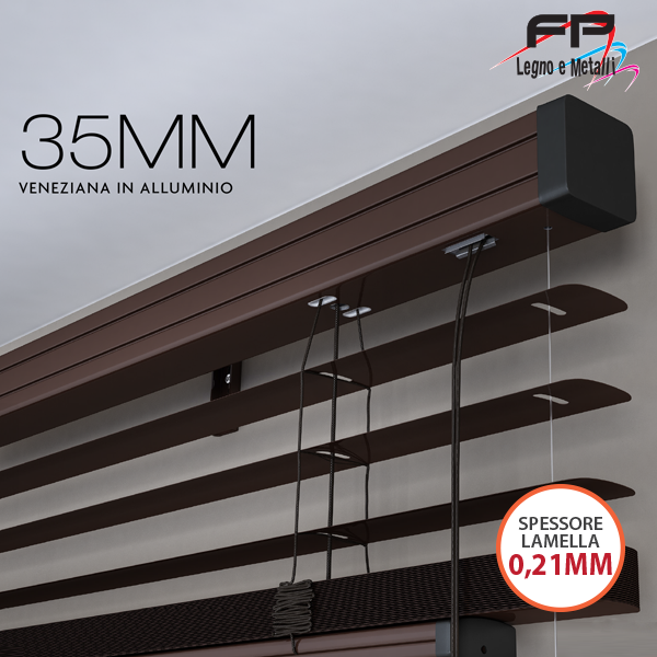 La Veneziana 35 mm è una tenda con comando a due corde per sollevare ed orientare. Lamelle in alluminio da 35 mm, cassonetto 37x37 mm e terminale 34x16 mm. Uso interno