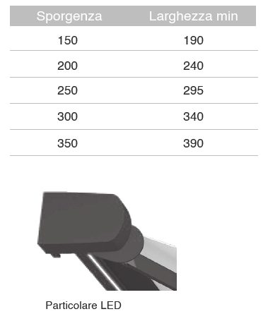 Realizzabile su misura in base alle necessità, consente di coprire fino a L 600 x SP 350 cm (larghezza per sporgenza). Di serie fornita con argano e senza volant.