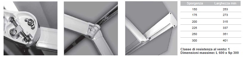 Larghezza massima consigliata 600 cm; sporgenza massima consigliata 300 cm.