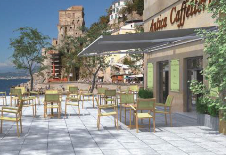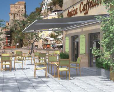 Tenda a bracci estensibili con catena in acciaio inox, su doppia barra quadra 40x40 mm in ferro zincato e verniciato, con supporto braccio a posizionamento laterale e intermedio.