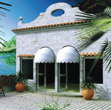 Tenda con richiamo a fune, particolarmente adatta per realizzare coperture di vani semicerchi. Struttura in alluminio.