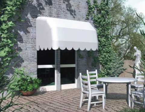 Tenda con richiamo a fune, particolarmente adatta per esercizi commerciali ed in genere per vetrine, finestre e balconi.